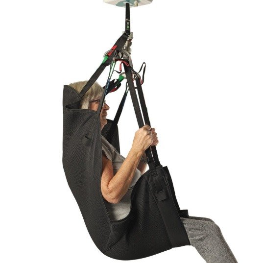 The Deluxe Recline by HighStar Healthcare is a comfortable sling available with or without head support, suitable for seated or reclined positions. Ideal for amputees and clients with poor skin integrity, it’s compatible with any loop-style floor or ceiling lift. Made from spacer fabric, it supports extended use. The page includes material details, size options, and downloadable resources, along with multiple product images showing various angles and usage positions.