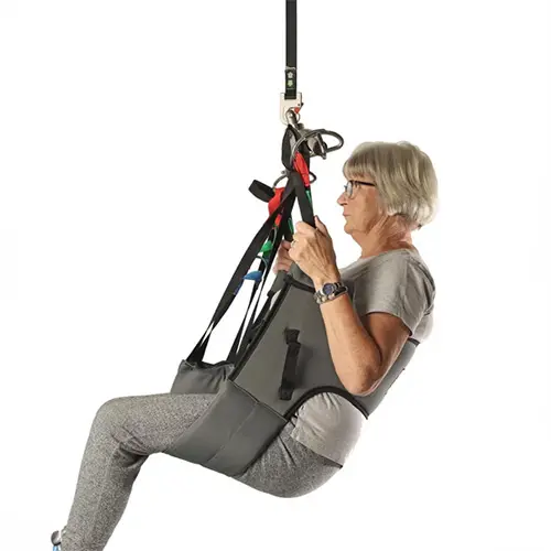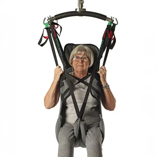 The HighStar Hygiene Sling provides maximum support for toileting, featuring both back and head support with a self-adjusting waist strap for precise positioning during transfers. Made from highly washable woven fabric, it is compatible with any loop-style floor or ceiling lift. The sling is designed for comfort, stability, and easy cleaning, and is available in multiple materials including woven, spacer, mesh, and quilted options, ensuring adaptability to different care needs and environments.