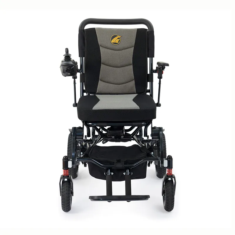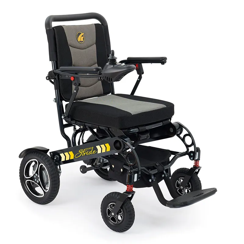 Designed for comfort and convenience, the Stride features a padded seat with a tall backrest, comfort spring suspension, and intuitive joystick controls for effortless operation. The chair folds easily for storage and transport and includes offboard charging for added flexibility. With airline-approved lithium-ion batteries and a practical operating range, the Stride Power Wheelchair is an excellent choice for users seeking a reliable, portable power mobility solution that balances comfort, performance, and everyday practicality.
