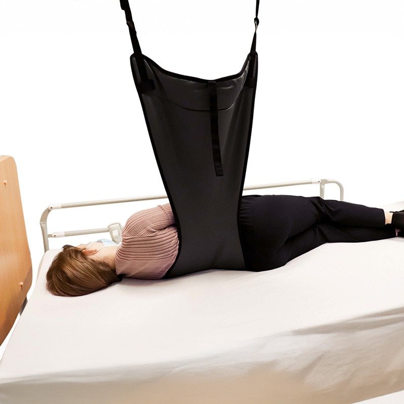 The Tri-Turner Sling by HighStar is a dual, triangular-shaped, padded sling designed for full back support, aiding in turning in either direction in bed. With a 625 lb. capacity, it provides access for hygiene care, wound care, offloading, and dressing. Recommended in Black Spacer fabric, it offers ventilation, slight stretch for body contouring, and pressure relief. Velcro straps secure the sling to prevent migration, ensuring safety, stability, and ease of use in patient handling.